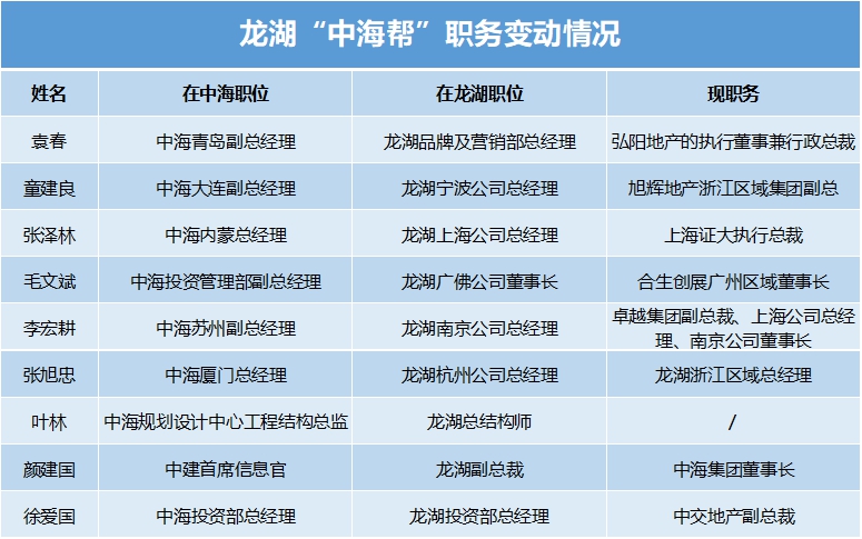 以“中海帮”为例,2014年6月才加盟龙湖的颜建国,成为最早离巢的一员。彼时消息显示,2016年12月2日,颜建国因个人事务离开龙湖,并回归中海。