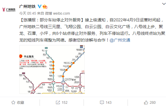 自2022年4月9日运营时间起,广州地铁二号线三元里、飞翔公园、白云公园、白云文化广场,八号线上步、聚龙、石潭、小坪等8个站点停止对外服务、列车不停站运行。八号线终点站为聚龙的短线列车调整为同德。